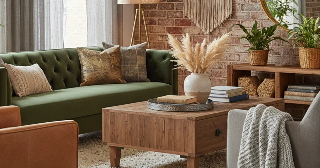 Bringing nature into your living room adds a peaceful, grounding effect. Materials like wood, stone, rattan, and greenery help create a sense of calm. These natural elements blend seamlessly with warm lighting and textures, enhancing the cozy atmosphere.